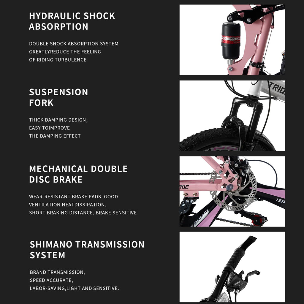 - 【Dual Suspension Bike】 - These all-terrain MTB feature dual suspension. The thickened outer wall is more resistant to shocks. The shock absorbers help absorb shocks. The parallel bars can adapt to pressure road conditions. Greatly improve the comfort during riding and allows people to enjoy riding